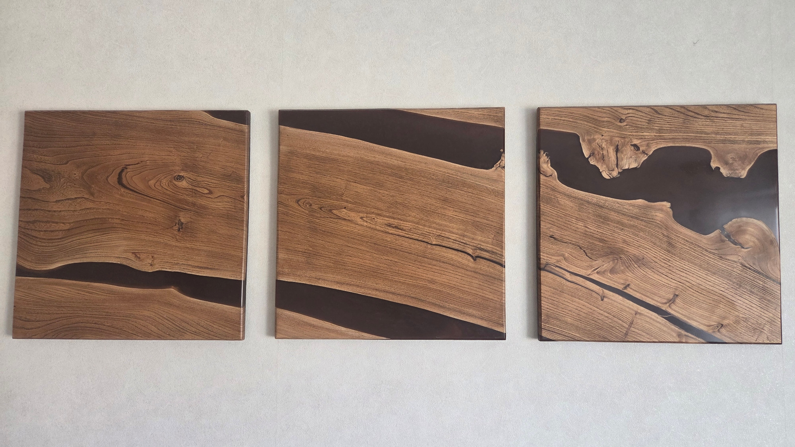 Three square wood and resin art panels are displayed against a light grey wall. The panels are arranged in a horizontal row. Each panel features light brown wood with a section filled with dark brown…read more
