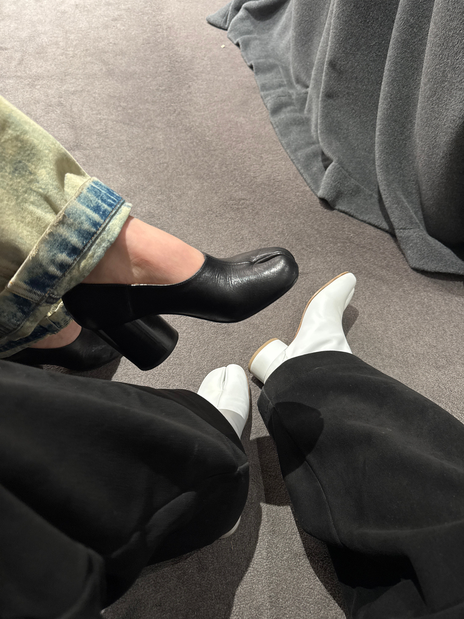 An overhead shot shows two pairs of feet, one wearing black Tabi heels and the other wearing white Tabi boots. The foot wearing the black heels is clad in a distressed denim jacket cuff. The other foo…read more