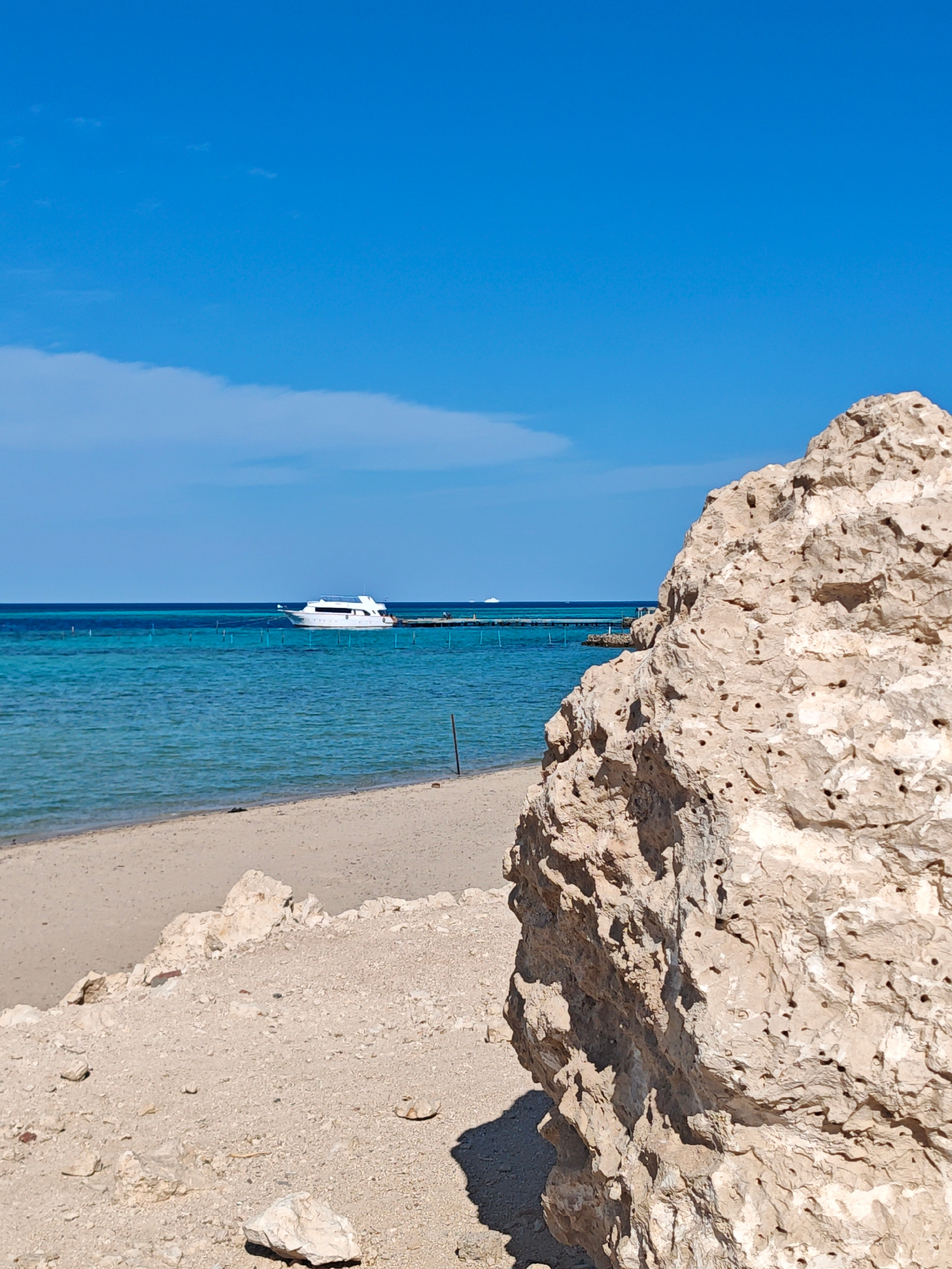 The image depicts a static coastal scene in Al Ahia', Egypt, under a bright, clear blue sky with minimal white clouds. A large, irregularly shaped, light beige rock formation, exhibiting a porous andβ¦read more