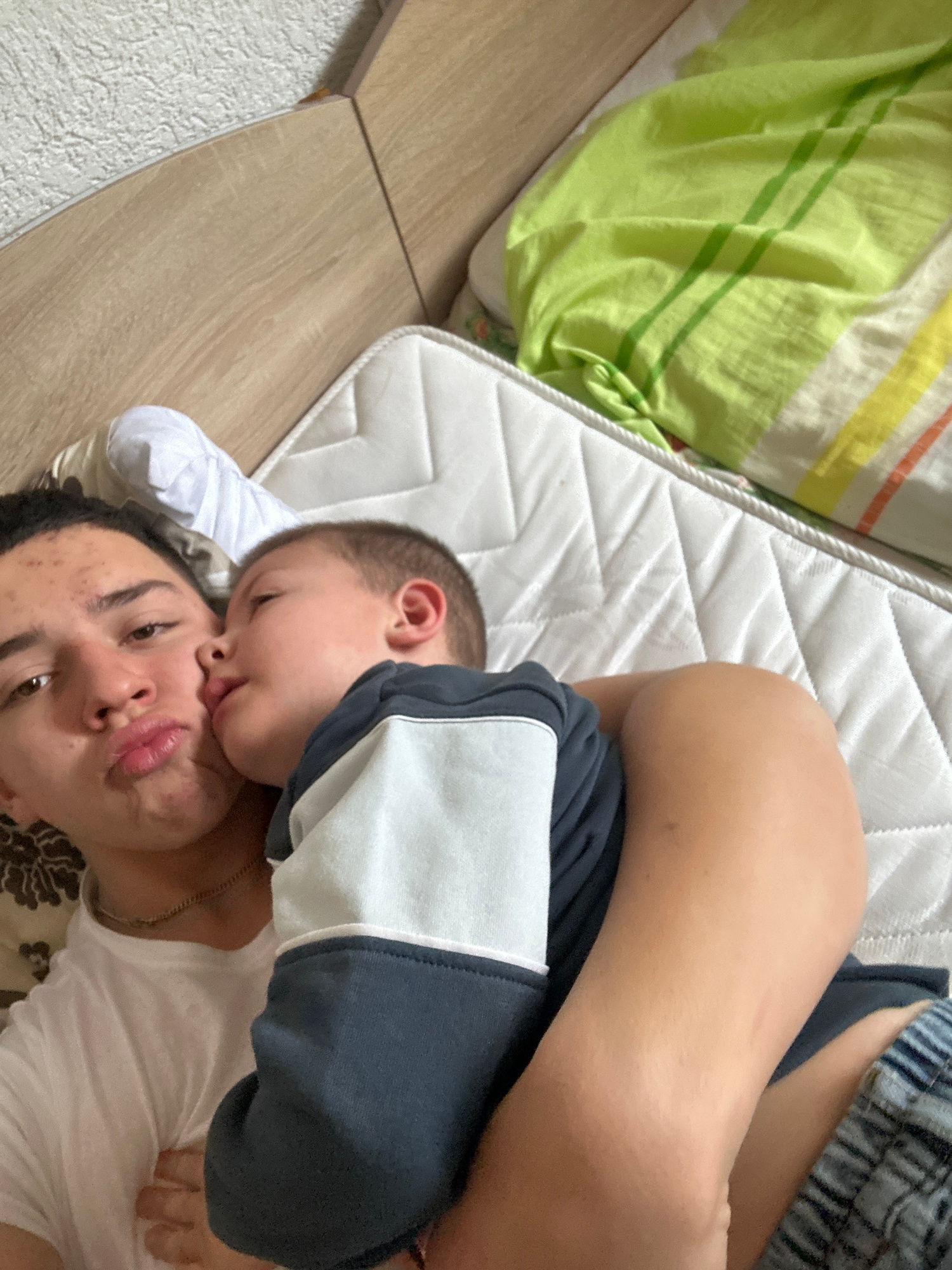 The image displays an intimate moment between two individuals, an adult and a child, lying down indoors. The adult, positioned in the foreground, lies on their back, looking towards the camera with sl…read more