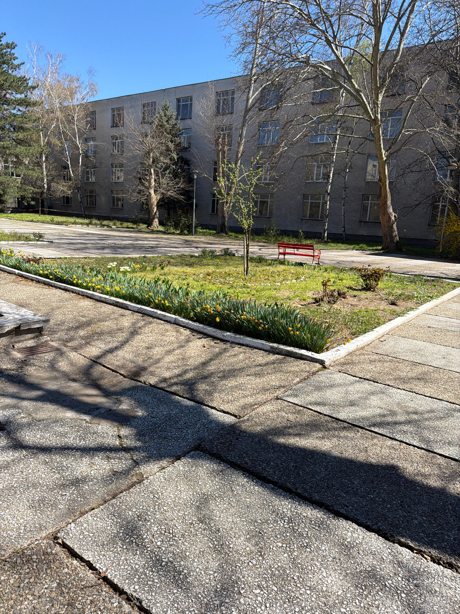 The image depicts an outdoor scene, likely in an urban area in Pazardzhik, Bulgaria. A multi-story, Soviet-era building with numerous windows is on the left side of the frame. Bare trees and some tree…read more