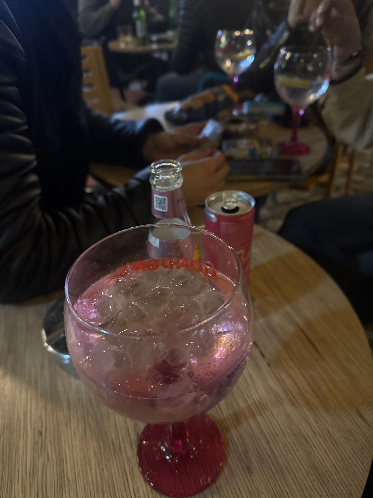 The image depicts a tabletop scene, likely in a restaurant or bar. A large wine glass filled with ice dominates the foreground, with a can of soda and a bottle of pink-colored liquid nearby. A person…read more