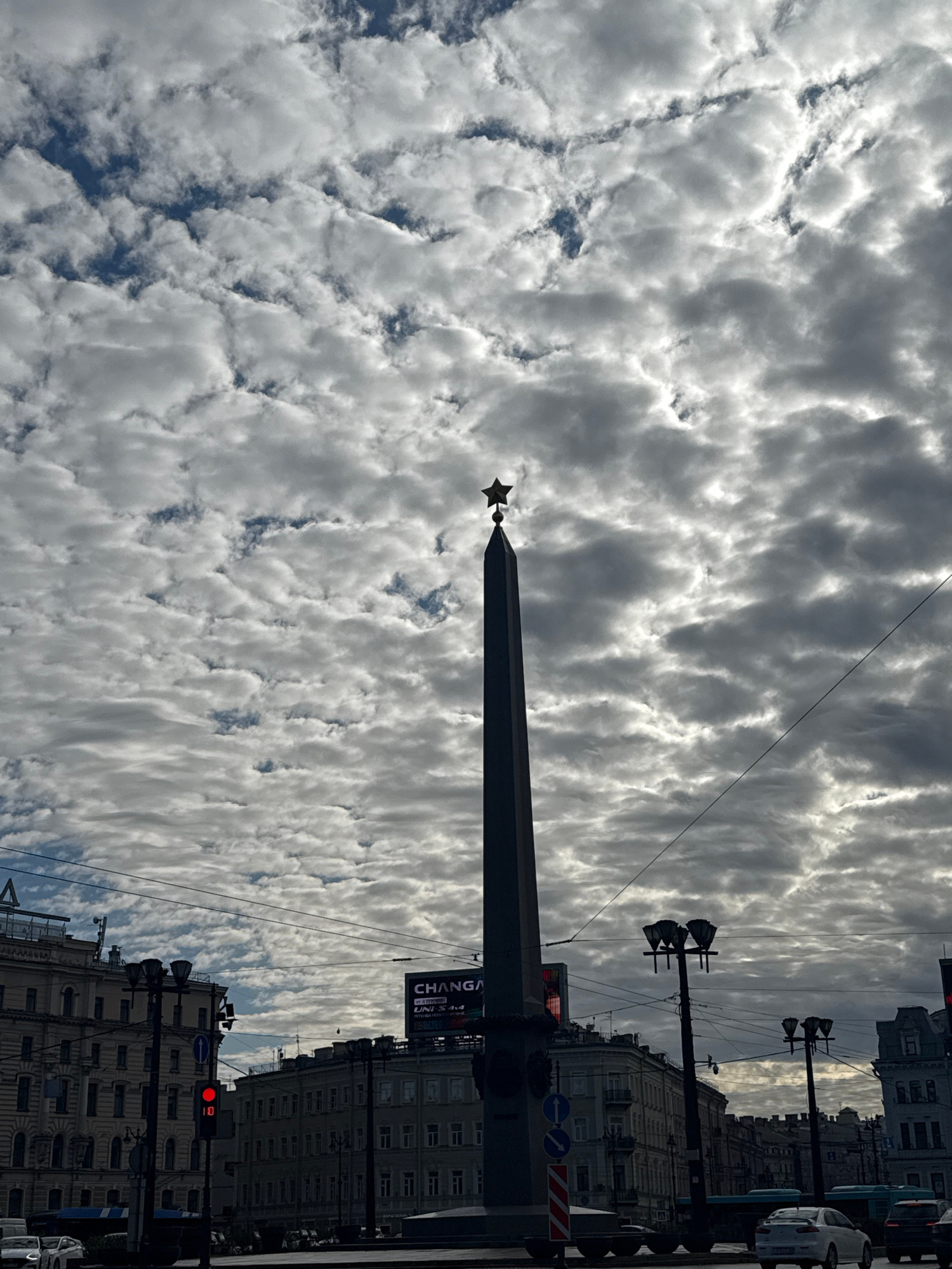 A street-level upward view captures an urban scene in Saint Petersburg, Russia, dominated by a tall monument against a dramatic sky. In the center, a dark, slender obelisk-like column rises, topped wi…read more