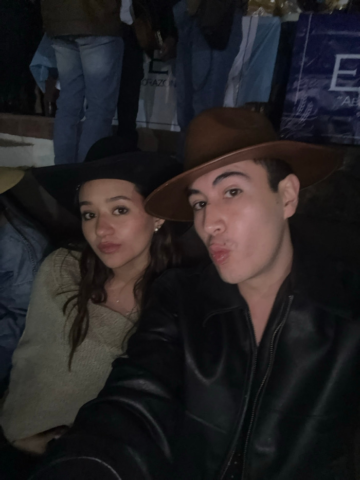 A young man wearing a brown cowboy hat and black leather jacket is posing for a photo with a young woman in a black beret. Both are making kissing faces at the camera. They appear to be lying down orβ¦read more