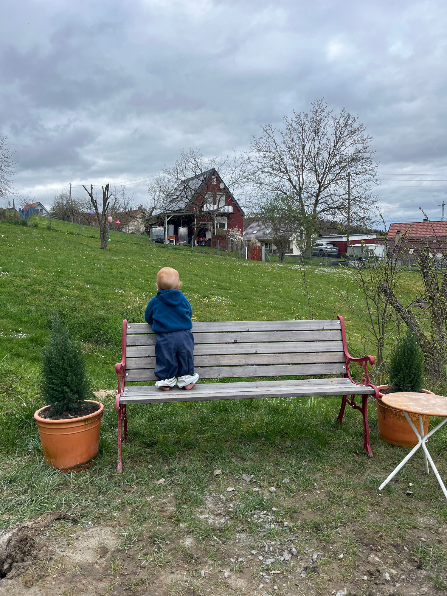 A child in a blue jacket and pants lies prone on a wooden bench outdoors. The child's blond hair is visible. The bench is surrounded by green grass with small white flowers, and two potted evergreen p…read more