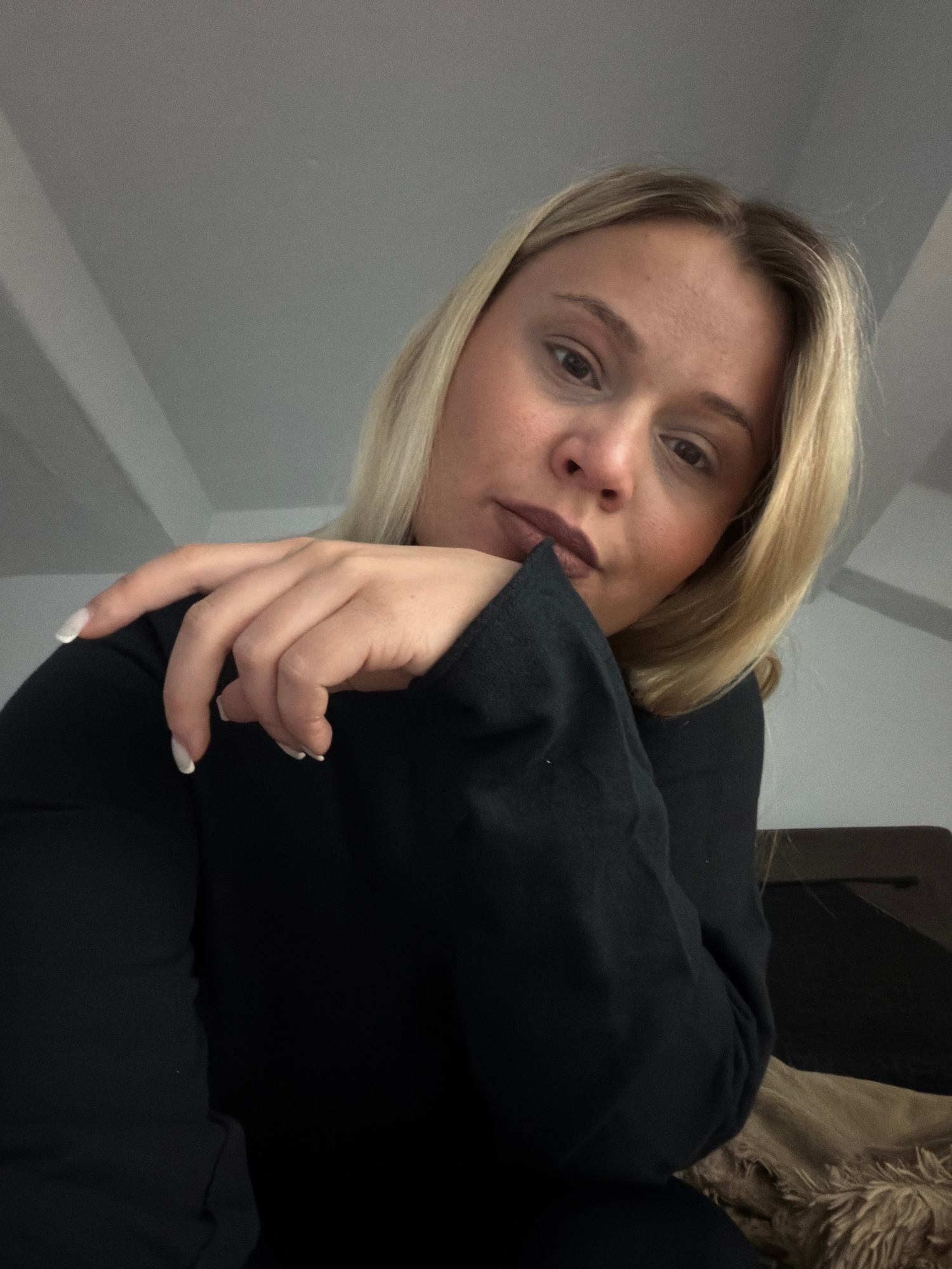 A woman with blonde hair and light skin is positioned in the foreground, looking toward the camera with a neutral expression. Her hand is near her face, with fingernails painted white. She is wearing…read more