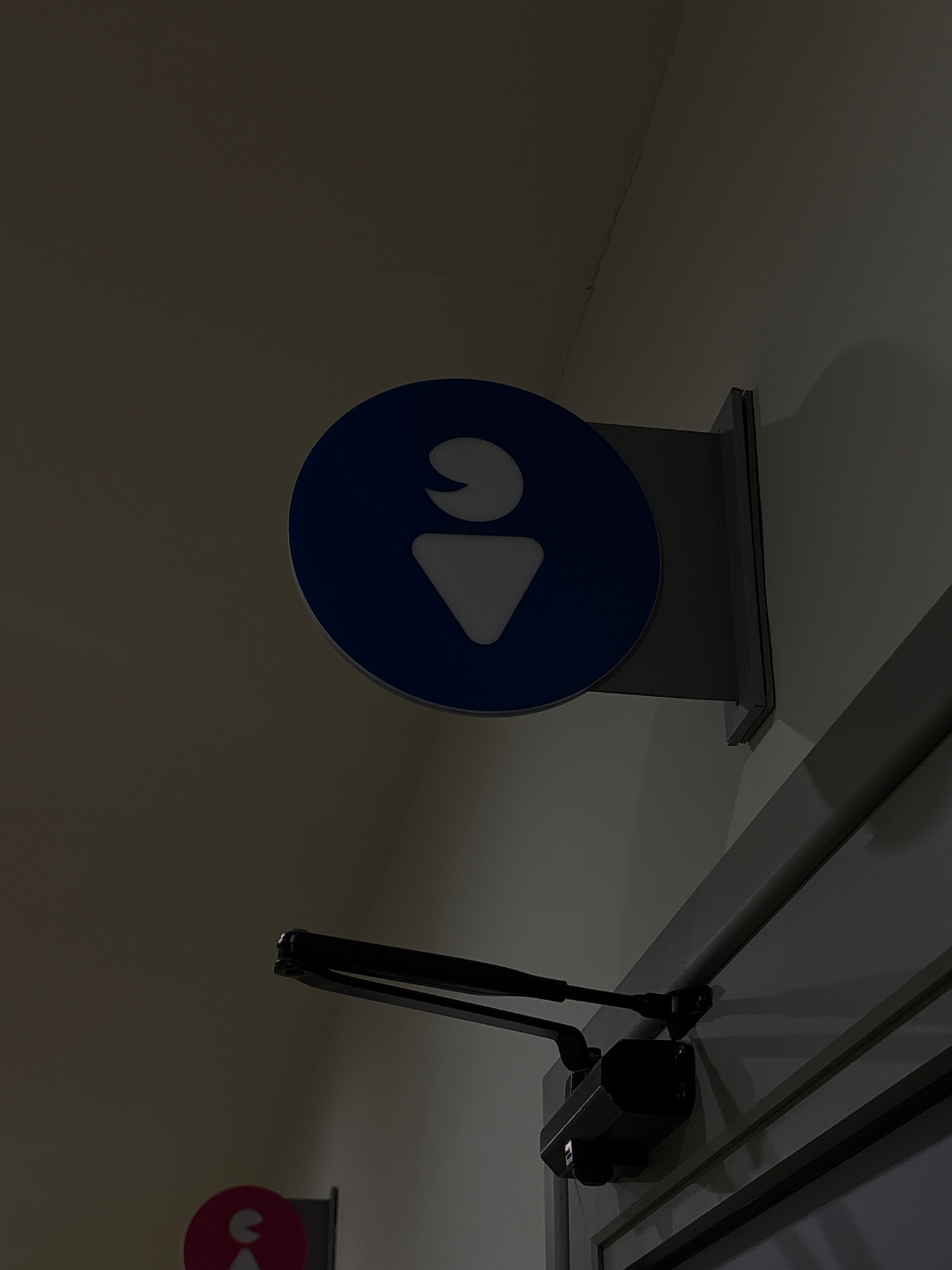 A low-angle, indoor shot depicts a blue, round sign with a white graphic consisting of a partial circle and a right-pointing triangle. The sign is suspended from the ceiling by a gray metal bracket. T…read more