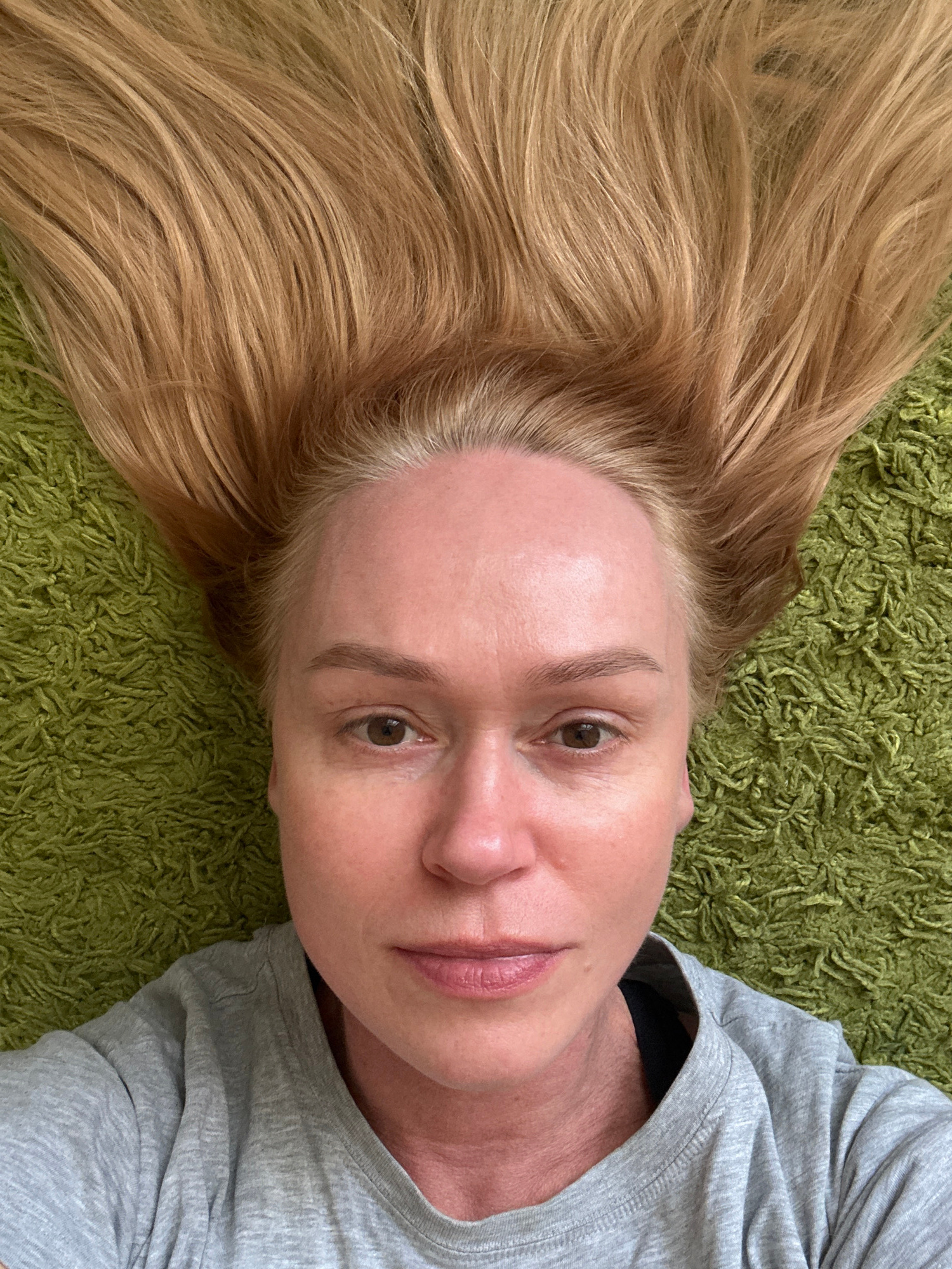A woman with light blonde hair is lying on a green shaggy rug, possibly indoors. She is wearing a light gray t-shirt. The woman's face is visible, revealing brown eyes, fair skin, and pink lips. The b…read more