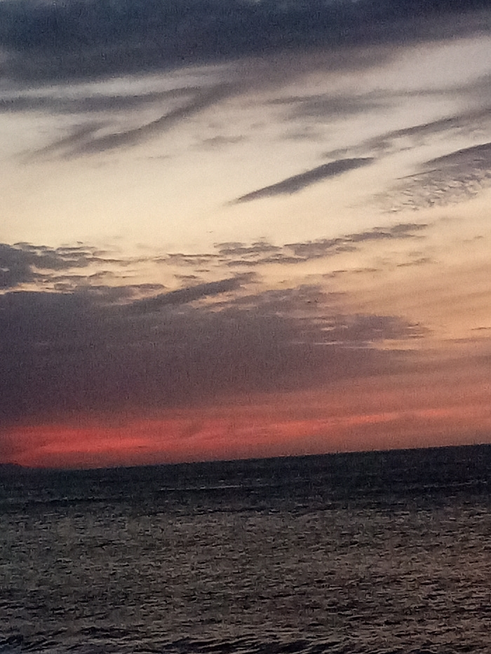 The image displays a horizon scene in Juan Griego, Venezuela, during a crepuscular period, likely sunset. The upper two-thirds of the frame is occupied by the sky, which exhibits multiple cloud layersβ¦read more