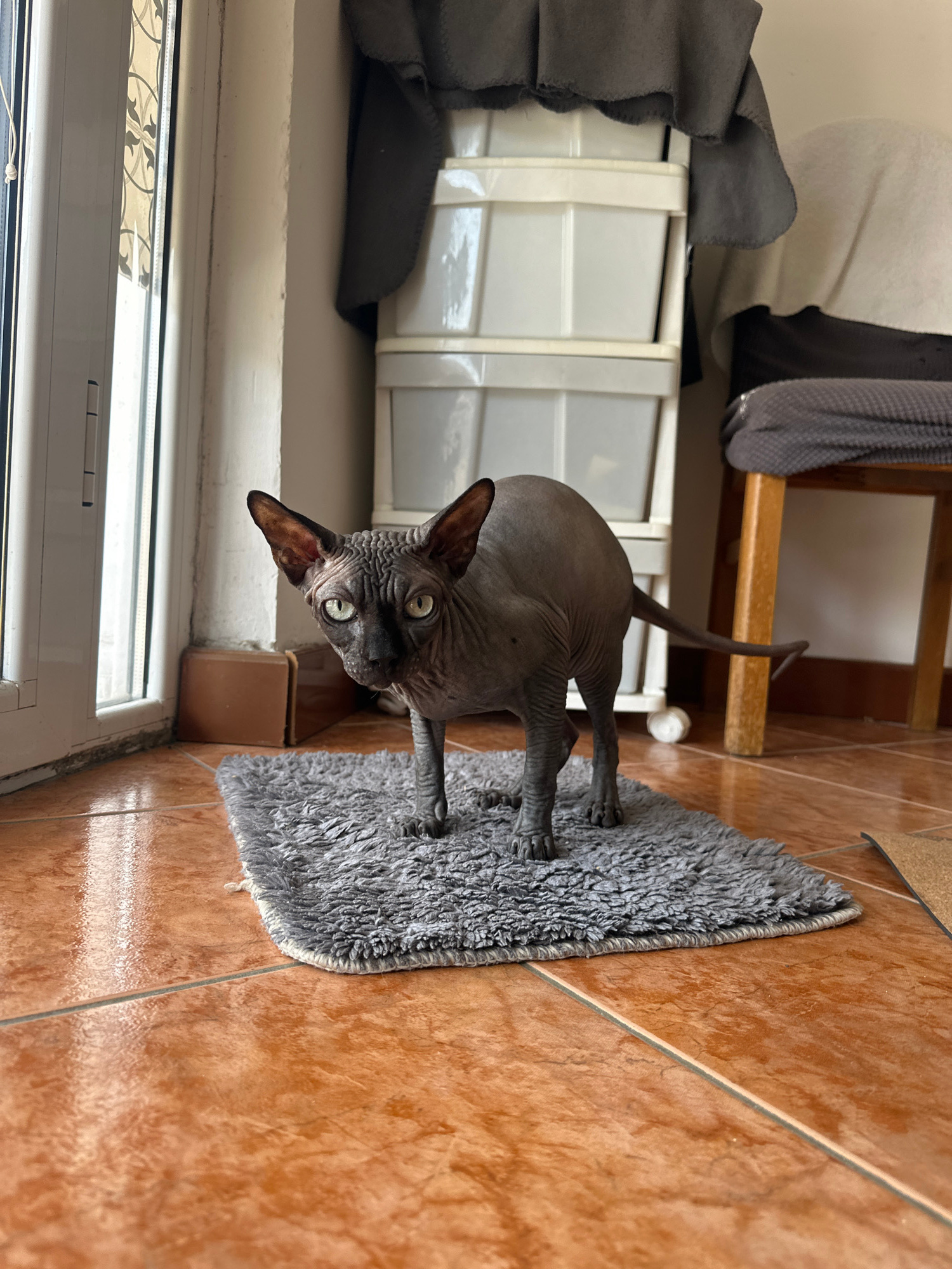 A dark grey Sphynx cat with prominent ears and bright green eyes is the central subject of this indoor, high-angle shot. The cat is standing on a textured, shaggy grey rug, with its body partially tur…read more