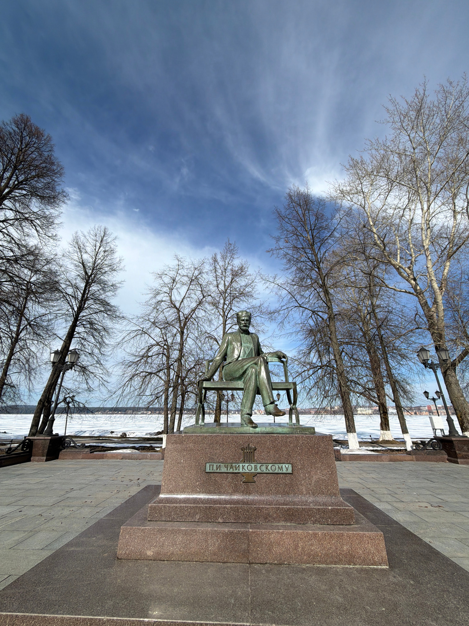 The image shows a statue of Pyotr Ilyich Tchaikovsky in Votkinsk, Russia. The statue depicts Tchaikovsky sitting on a chair. The base of the statue has the inscription "P.I. Tchaikovsky." The statue i…read more