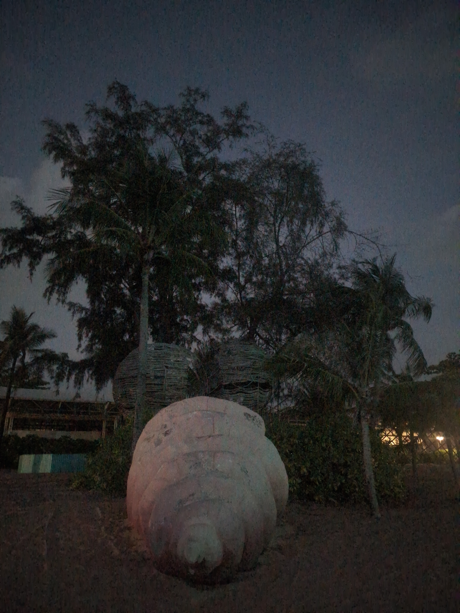At night in Phú Quốc, Vietnam, a large, spherical, stone structure stands near vegetation and a building. Palm trees are visible against a dark sky. Artificial light illuminates parts of the scene.