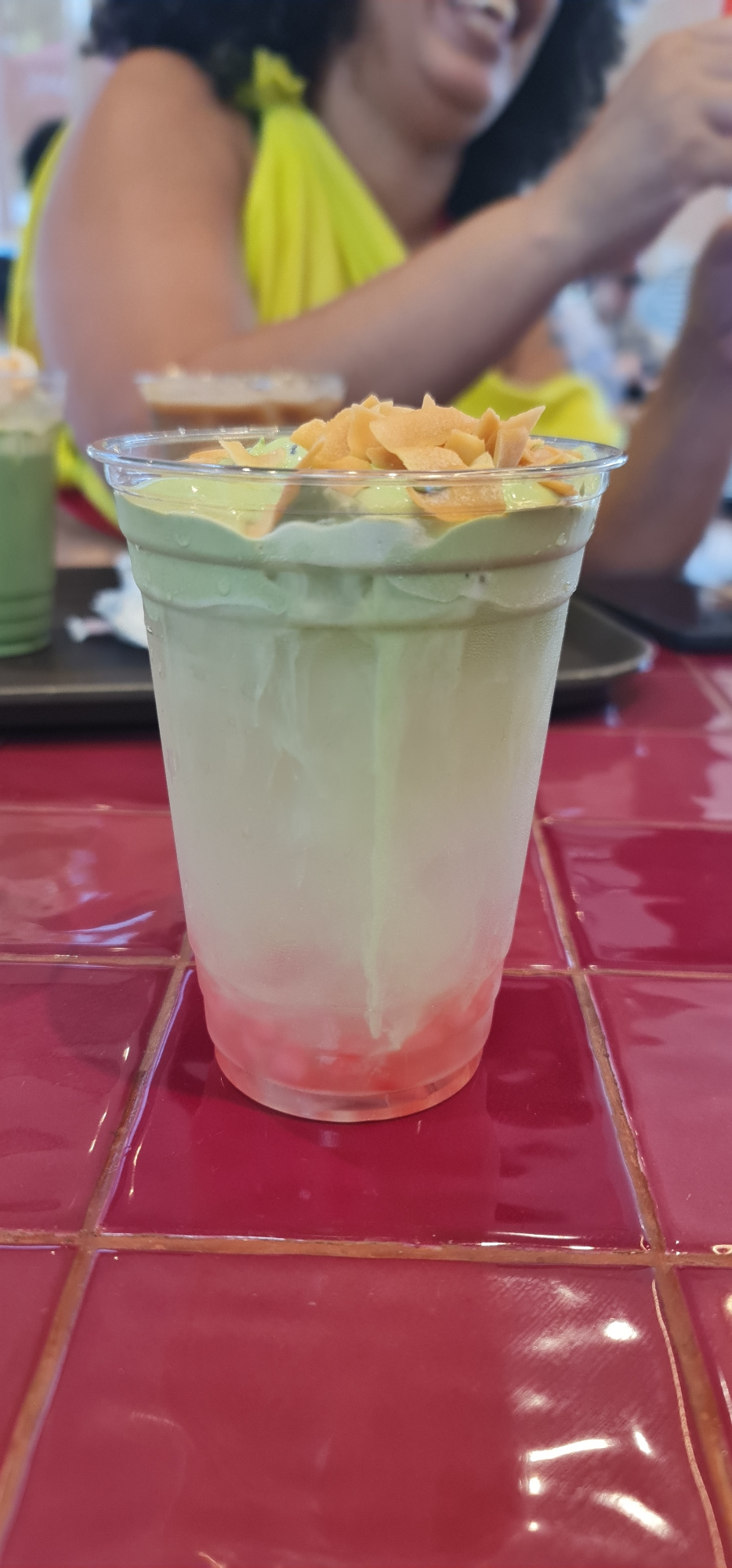 A plastic cup containing a layered beverage, possibly a smoothie or layered drink, with an orange topping is positioned on a black tray. The drink appears to have a reddish layer at the bottom and a l…read more