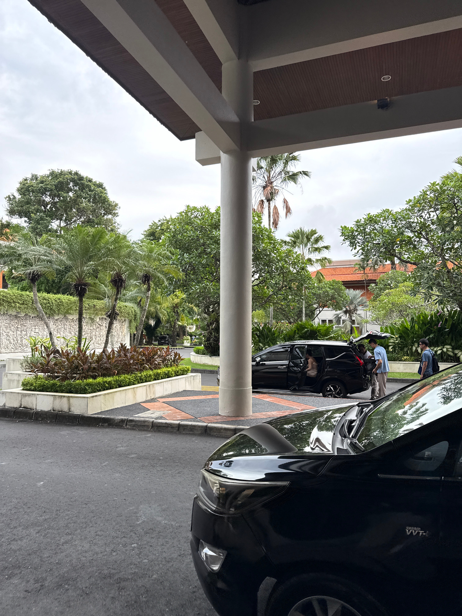 The scene is outdoors in Nusa Dua, Indonesia, showcasing a hotel or resort driveway. A black vehicle is parked on the right side of the frame, taking up a significant portion. A second, similar vehicl…read more