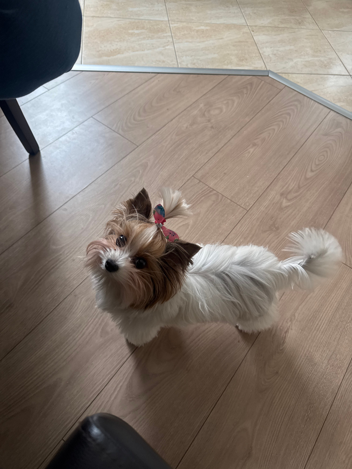 A small, fluffy dog with white, brown, and tan fur is the central subject of this indoor photograph, looking directly up at the camera with an attentive expression. The dog wears a colorful, multi-patβ¦read more