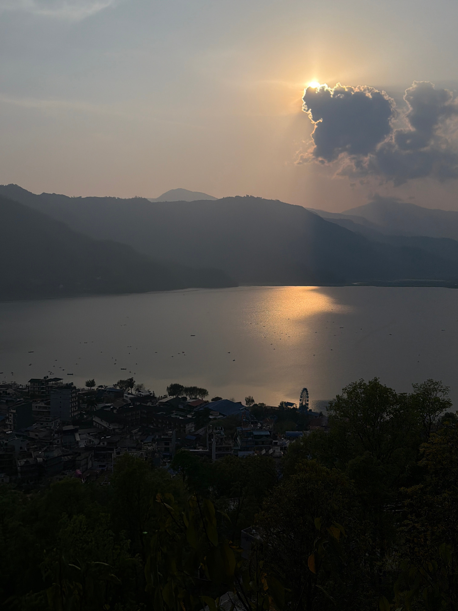 The image shows a sunset scene in Pokhara, Nepal. The sun is partially obscured by a cloud on the left side of the image. Mountains are visible in the background. A large body of water, likely Phewa L…read more