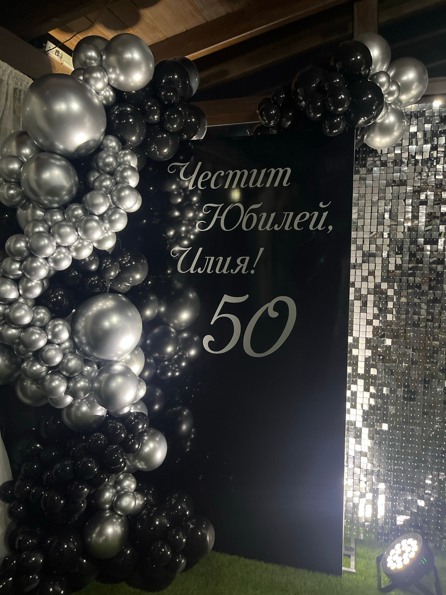 The image shows a black backdrop with silver text "Честит Юбилей, Илия! 50" (Happy Anniversary, Ilia! 50). The backdrop is decorated with an arrangement of black and silver balloons on the left and ri…read more