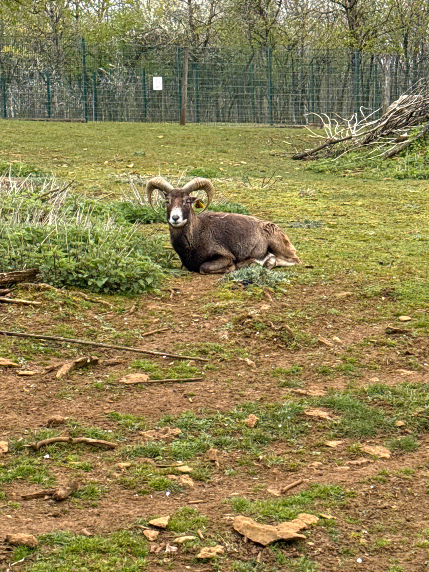 The image depicts a resting Mouflon, identified by its curved horns and a yellow tag on its ear, lying on a grassy area that transitions into a dirt and grass mix. The background includes a wire fence…read more