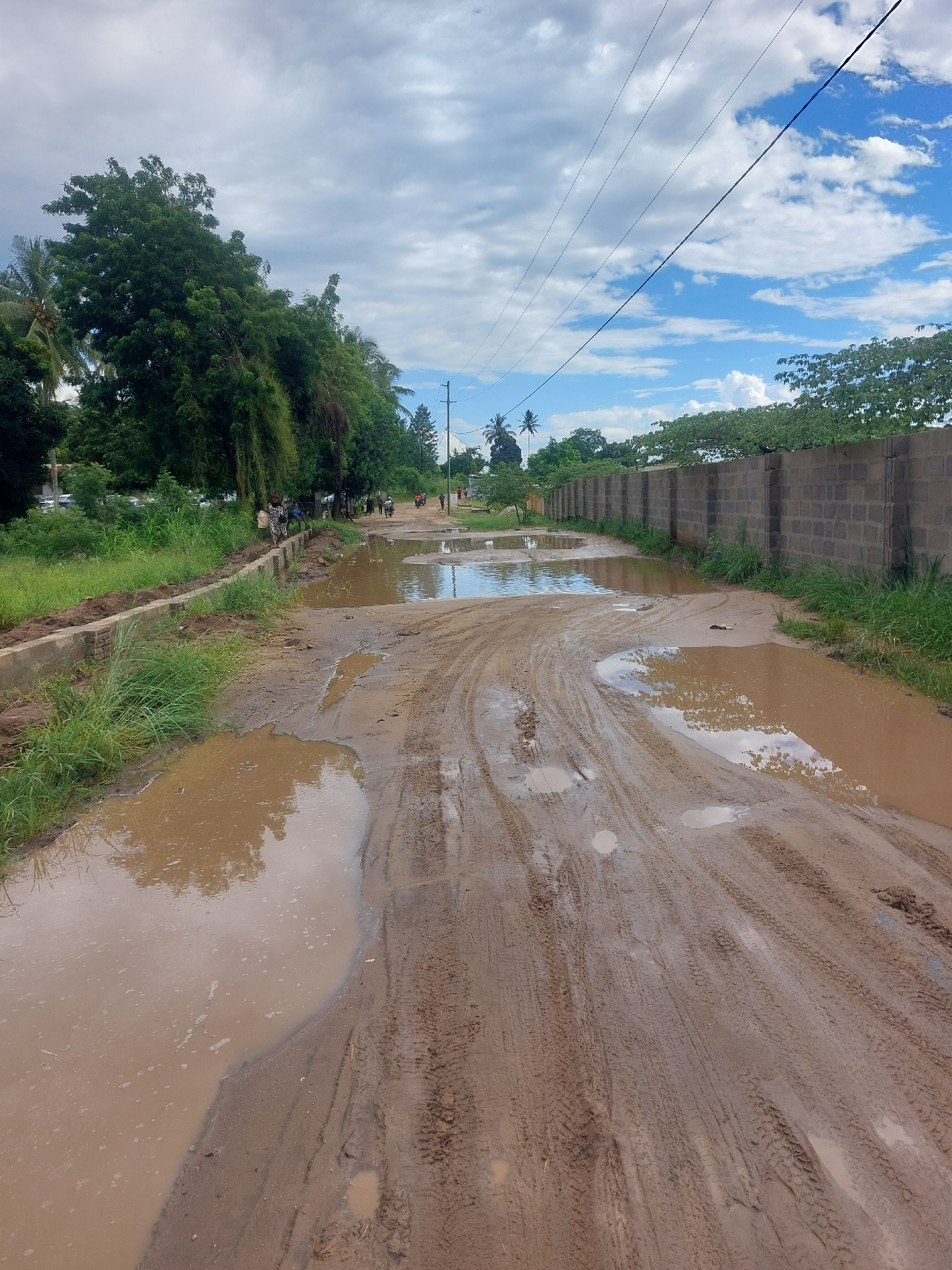 The image depicts a muddy road in Dar es-Salaam, Tanzania, heavily rutted with tire tracks and partially covered with standing water. A concrete block wall runs along one side of the road, intersperse…read more