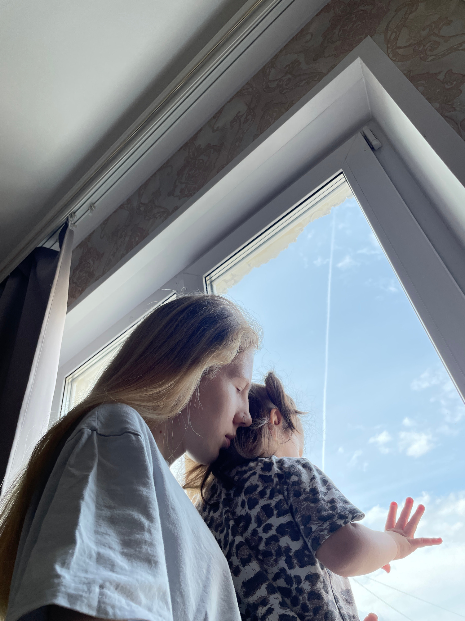 A low-angle shot depicts a woman and a child near a skylight. The woman has long blonde hair and is wearing a light-colored shirt. A small child with brown hair and wearing a leopard-print shirt is po…read more