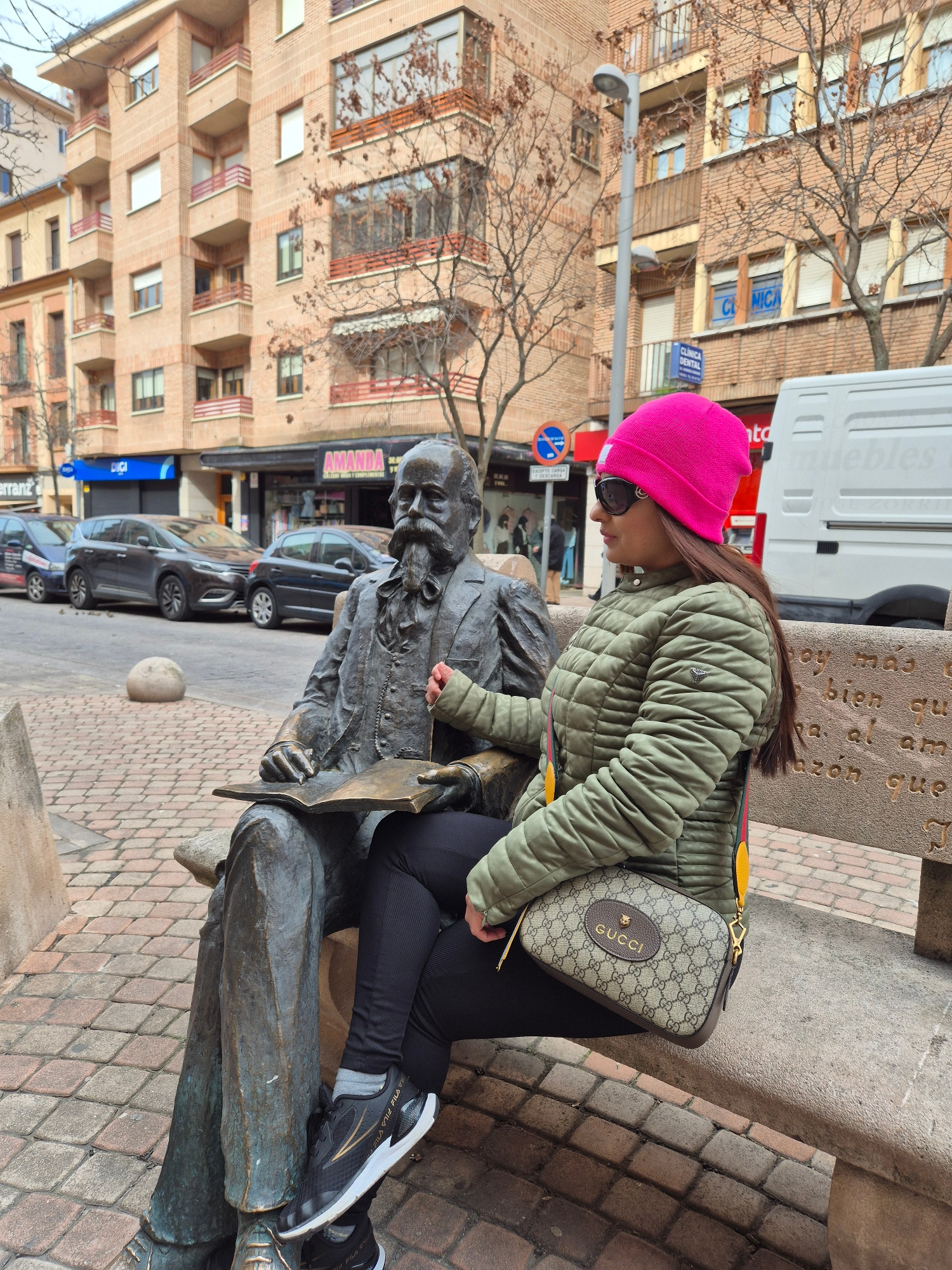 A young woman with long brown hair wearing a pink knit hat, sunglasses, an olive-green quilted jacket, black leggings, and black sneakers is sitting on the lap of a bronze sculpture of a man on a benc…read more
