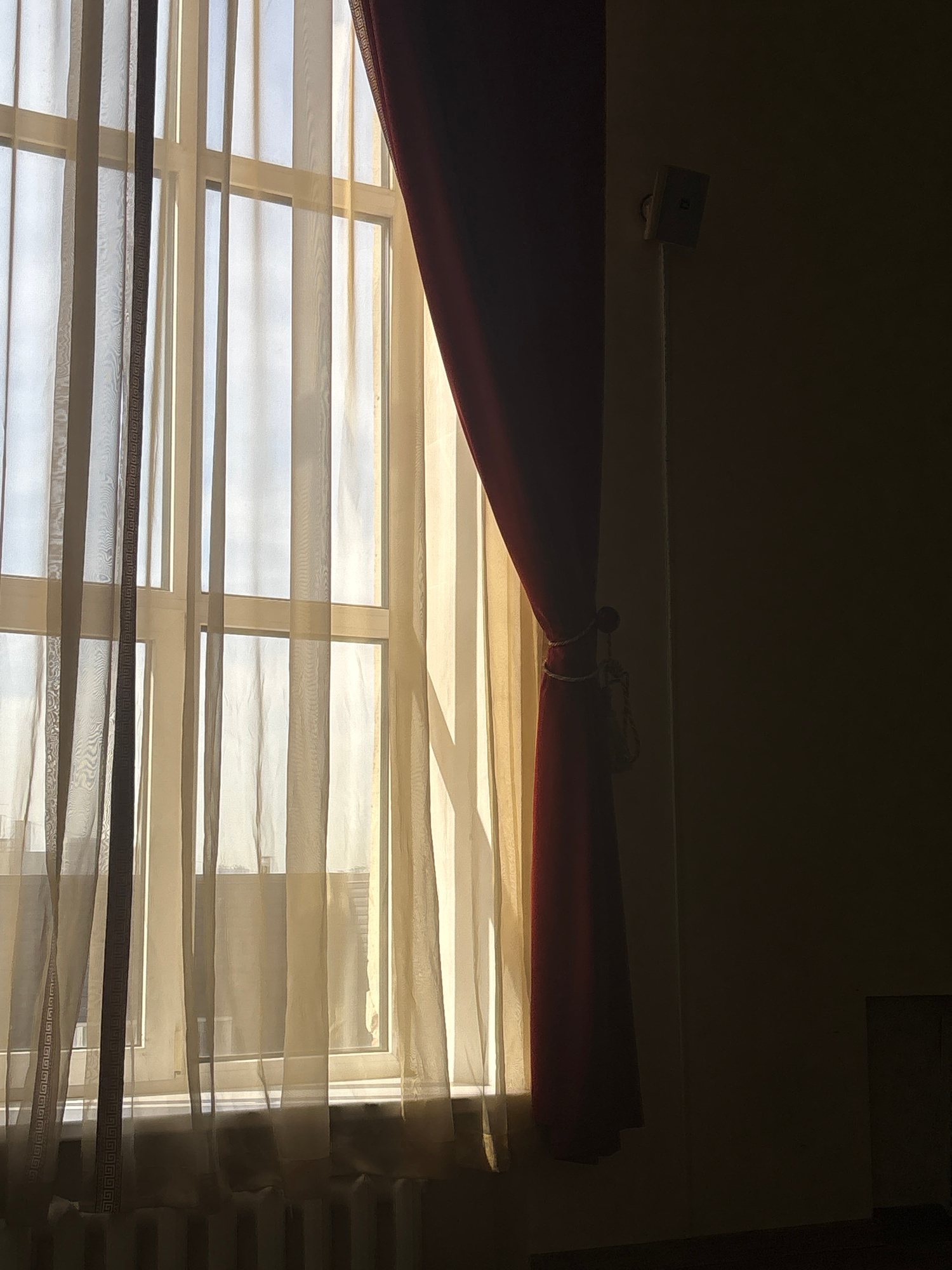 An eye-level, indoor shot depicts a window covered with sheer, horizontal blinds. A heavy, maroon-colored curtain is pulled back to the left, partially obscuring the top of the window frame. The light…read more