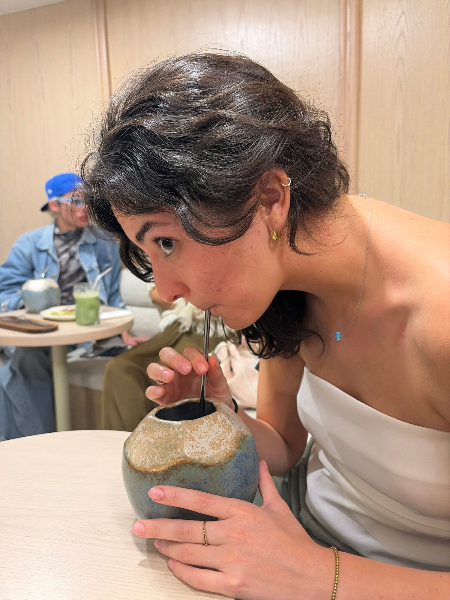 A dark-haired woman is drinking from a blue and tan ceramic vessel with a metal straw at a restaurant. She is wearing a white top and gold jewelry, including earrings, a necklace, a bracelet, and a ri…read more