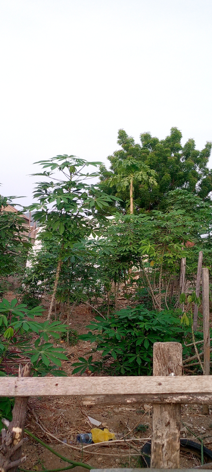 The image depicts a plot of land in Adankolo, Nigeria, overgrown with cassava plants and a papaya tree. A wooden fence is in the foreground, littered with debris. A residential building is visible in…read more