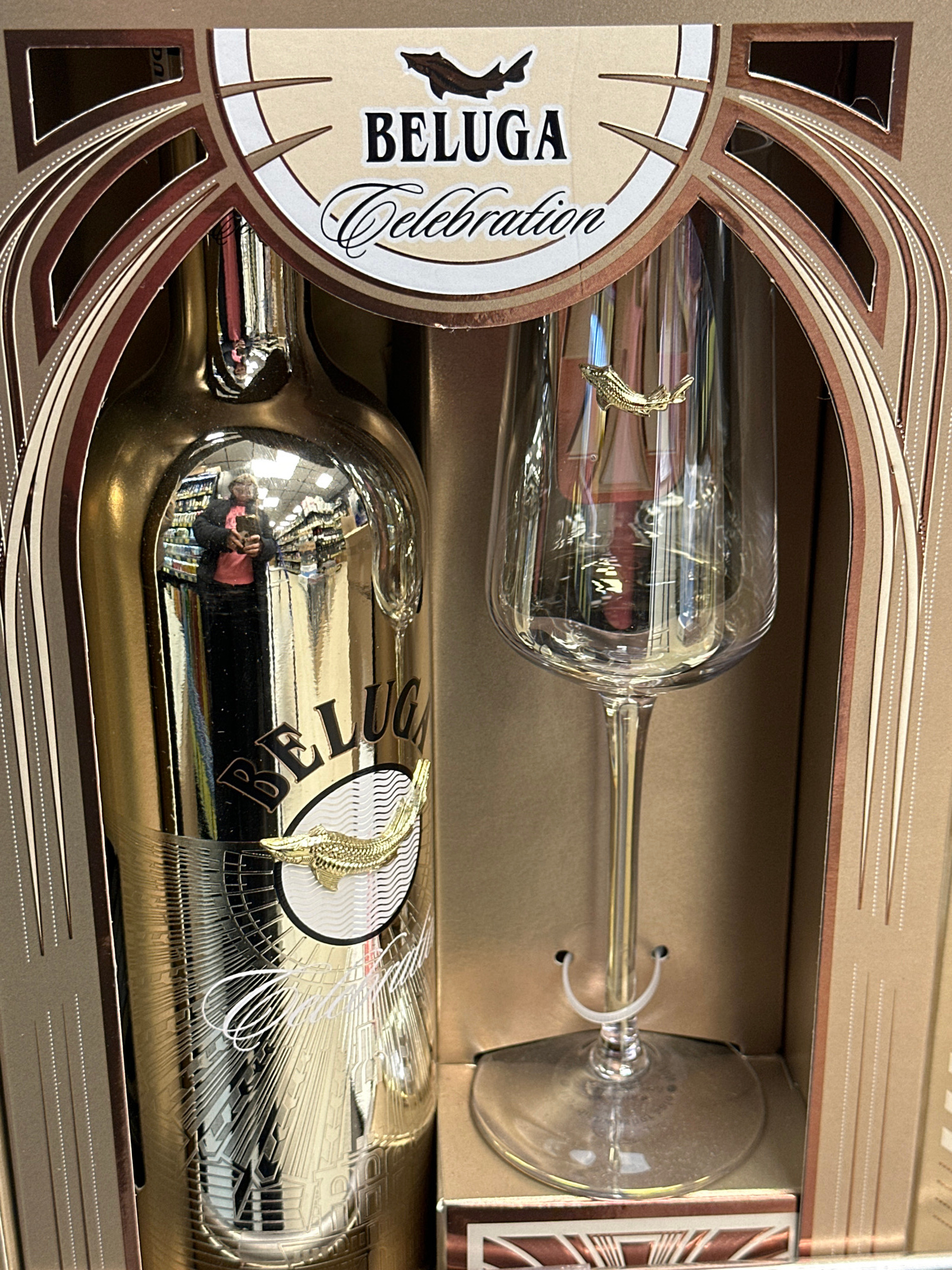 The image displays a Beluga Celebration gift set, likely of vodka, featuring a gold bottle and a glass. The set is presented in a decorative box with geometric designs. The scene is located in a retai…read more