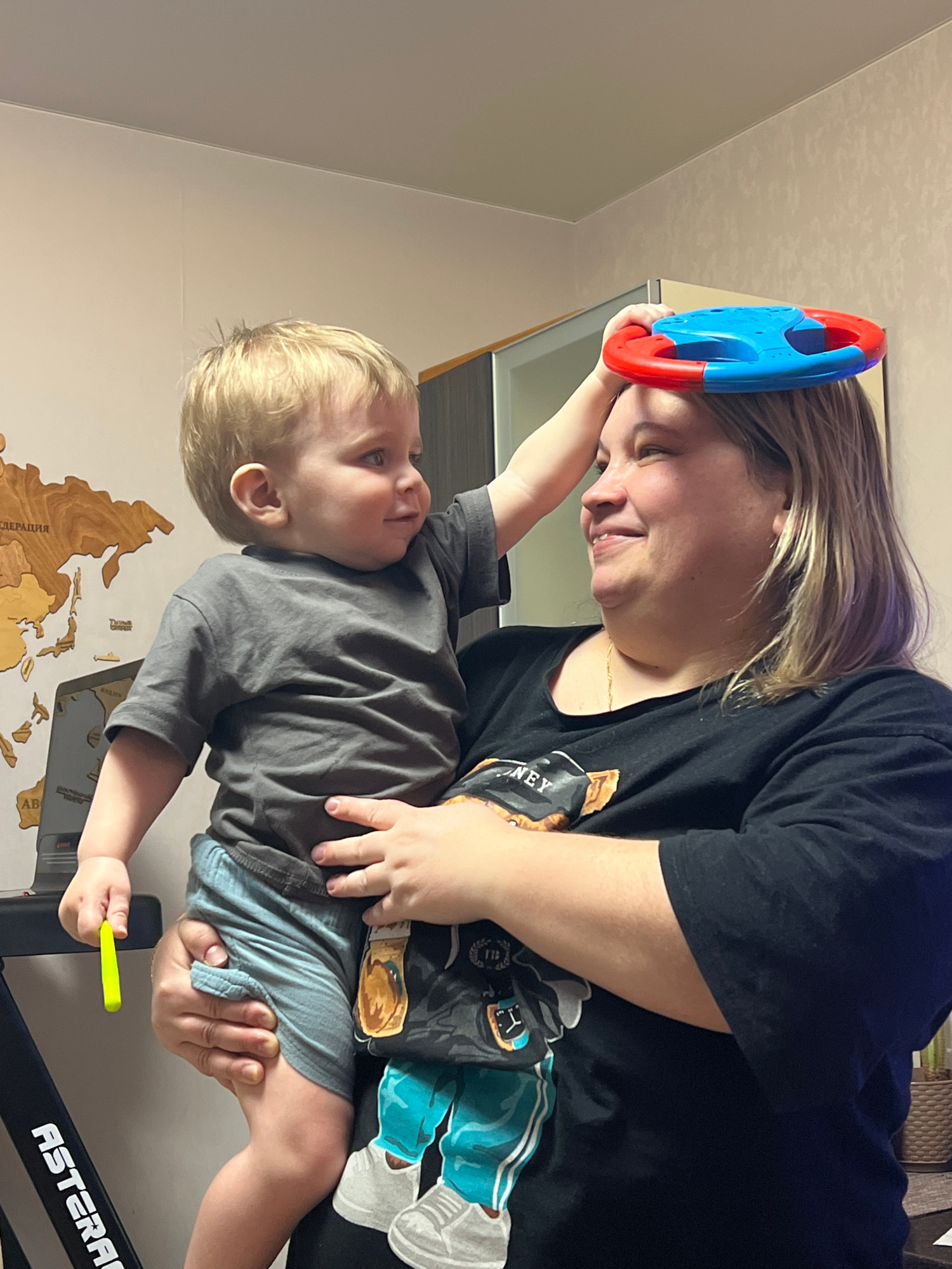 A woman in a black T-shirt holds a young child in her arms. The child is wearing a gray T-shirt and blue shorts. The woman is smiling at the child, who is looking up at a blue and red toy steering whe…read more