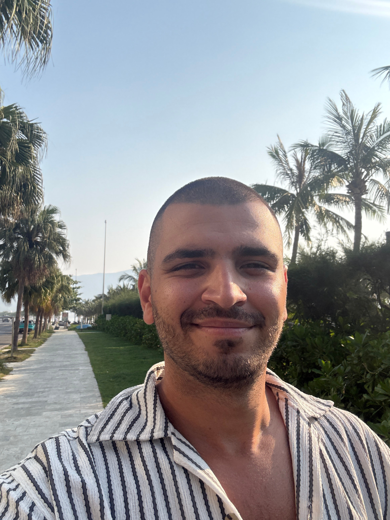 A man with a shaved head and a trimmed beard smiles at the camera. He wears a white striped shirt. Behind him is a street lined with palm trees. Beyond the trees is a glimpse of the ocean. This is lik…read more