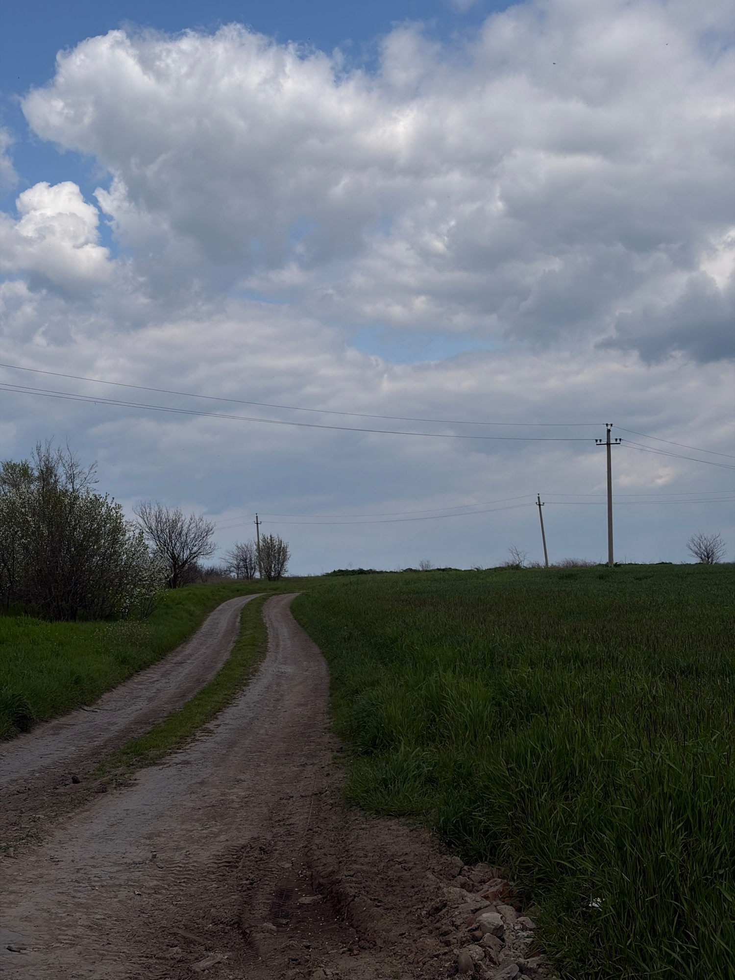 The image presents a tranquil rural landscape under a dynamic sky. A winding dirt road, marked by two prominent tracks, begins in the lower right and curves towards the left horizon, disappearing into…read more