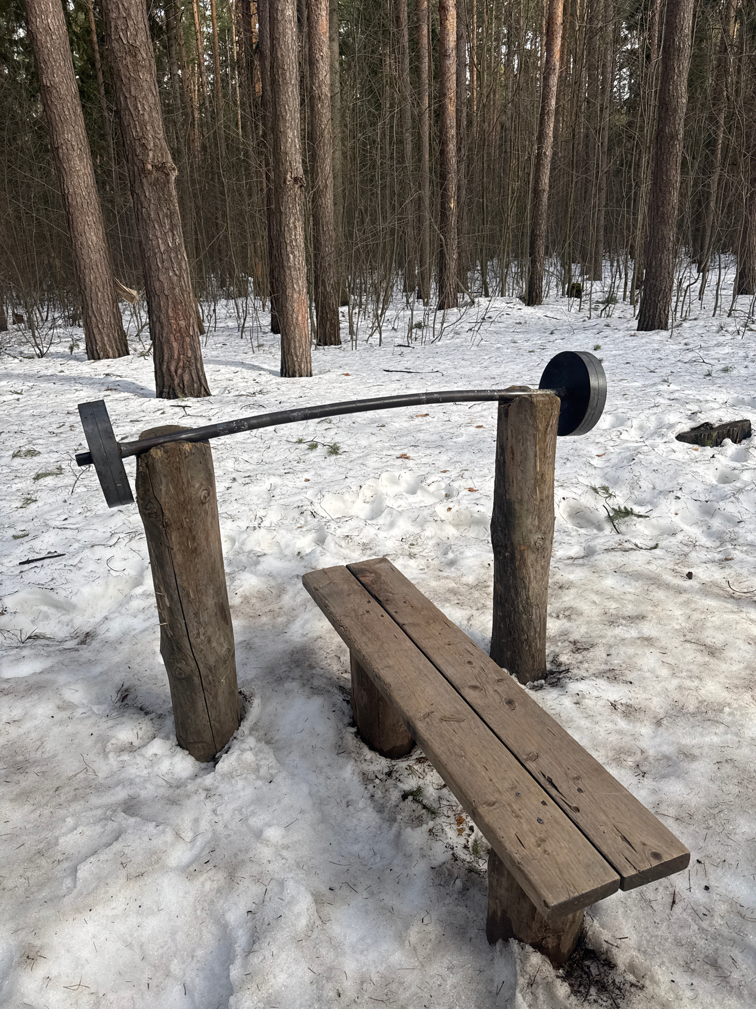 The scene is an outdoor exercise area, likely located within a park or wooded area in Votkinsk, Russia, given the prompt's information. The ground is partially covered with melting snow. The exercise…read more