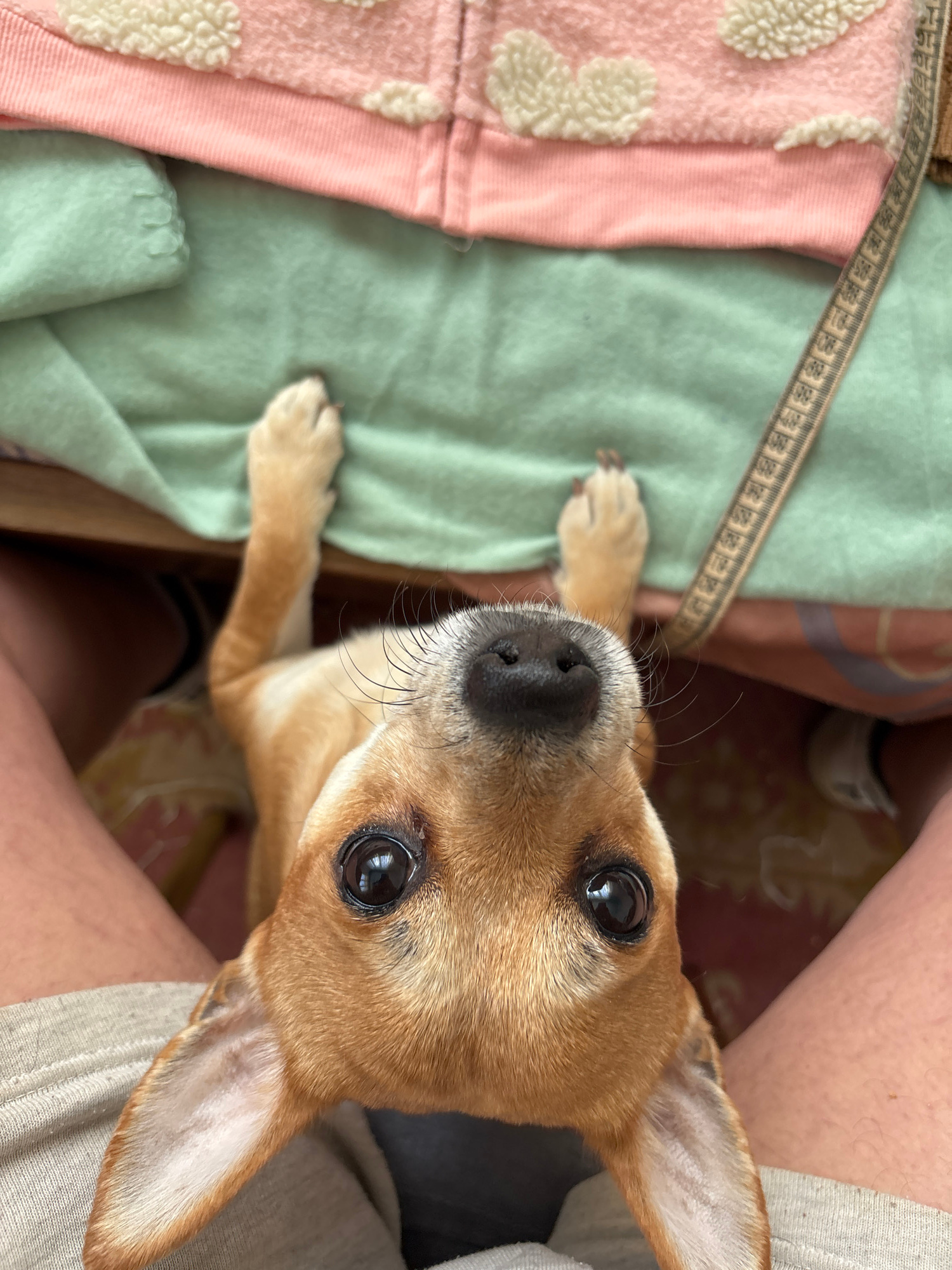A high-angle medium shot shows a light-brown Chihuahua dog looking up at the camera. The dog is positioned between a person's legs, with the person's legs and gray shorts partially visible. The dog ha…read more
