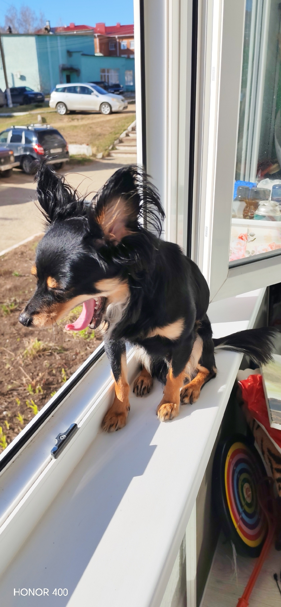 A long-haired, black and tan Russian Toy dog is sitting on a white windowsill, yawning, with its mouth wide open revealing its pink tongue. Outside the window, there is a view of a residential area in…read more
