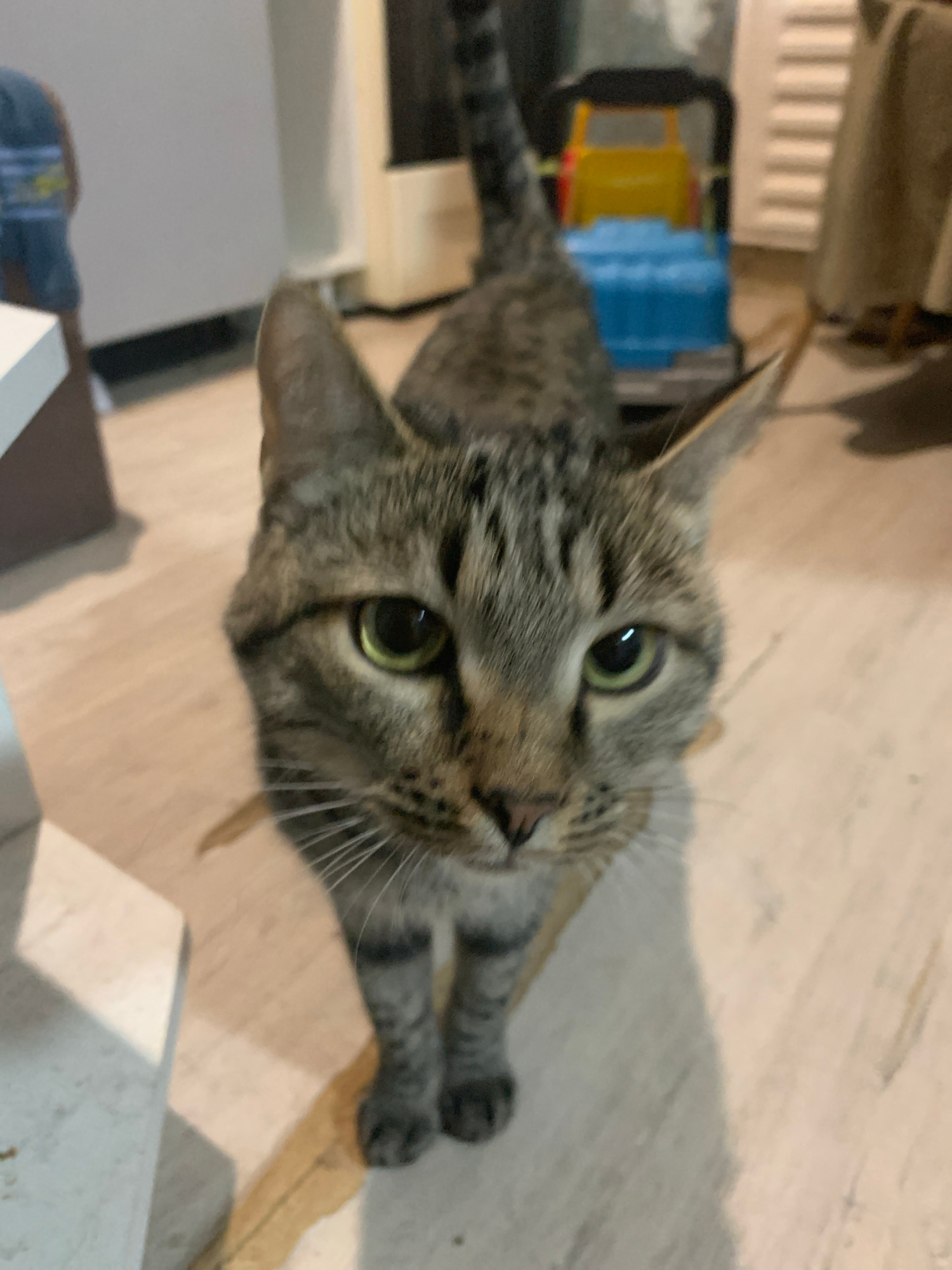 A tabby cat is the central focus of the image, looking up at the camera. The cat has green eyes and a tabby pattern coat. The cat's paws are extended slightly forward. The background is blurred, but…read more