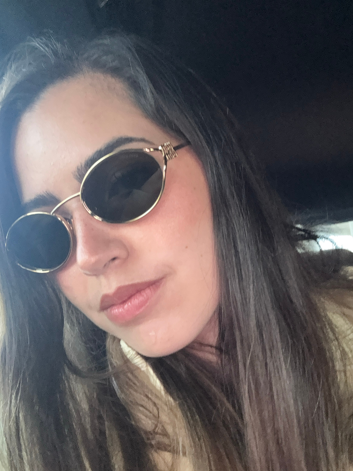 A woman is posing for a selfie. She is wearing sunglasses with round lenses and gold frames. Her hair is long and brown. The background is blurry, but it appears to be a dark interior. The location of…read more