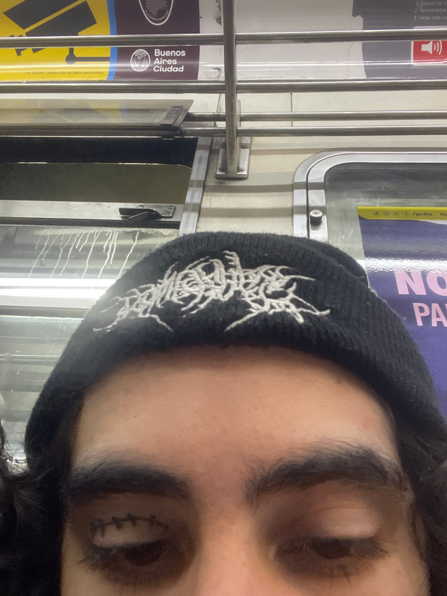 A close-up, slightly angled shot features a person wearing a black beanie with white gothic-style lettering, partially obscuring their forehead and the top of their face. The person's eyes are closed.…read more