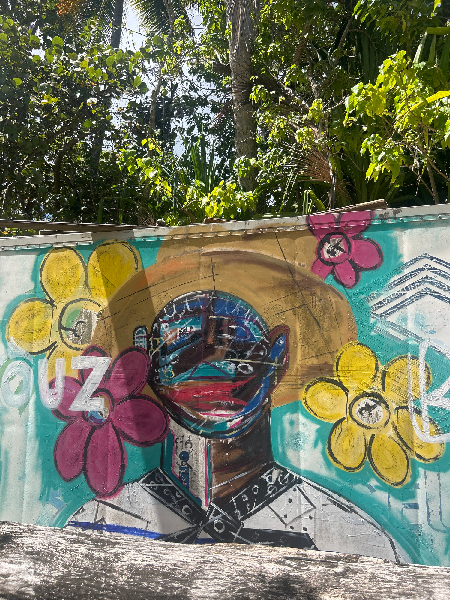 The image depicts a section of painted graffiti on a wall or vehicle. The background features a light teal color, with overlapping layers of abstract shapes, including flowers colored yellow and magen…read more