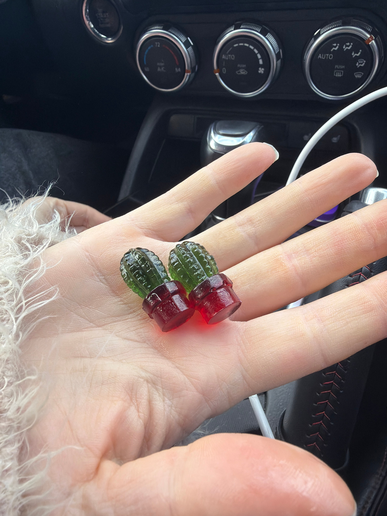 The image displays a close-up of a person's open hand holding two gummy candies, set against the interior of a car. The candies are distinctly shaped like small grenades, one translucent green and theβ¦read more