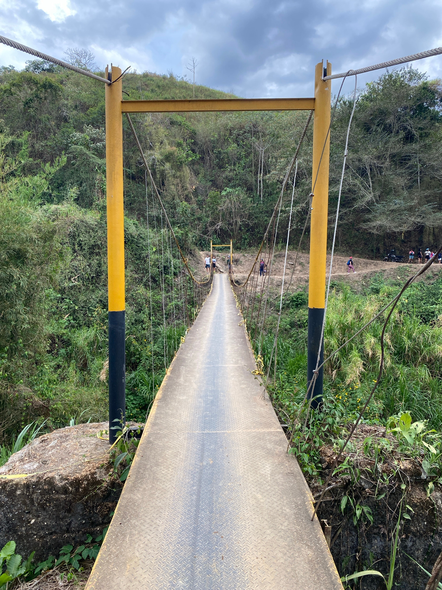 A suspension bridge in a rural, mountainous area, likely in Las Mercedes, Venezuela. The bridge has a metal deck with a diamond pattern and yellow support beams, partly painted black. Steel cables run…read more