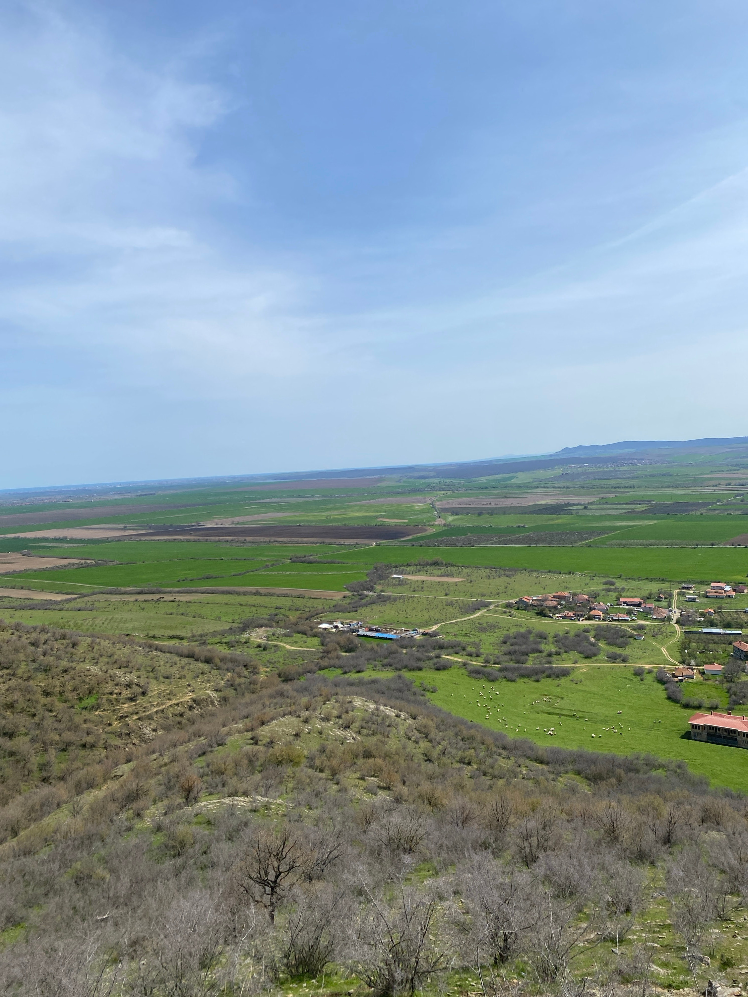 The image presents an aerial view of the landscape in the city of Goritsa, Bulgaria. The sky occupies the upper portion of the frame, exhibiting light blue hues with faint clouds. Below, a landscape u…read more