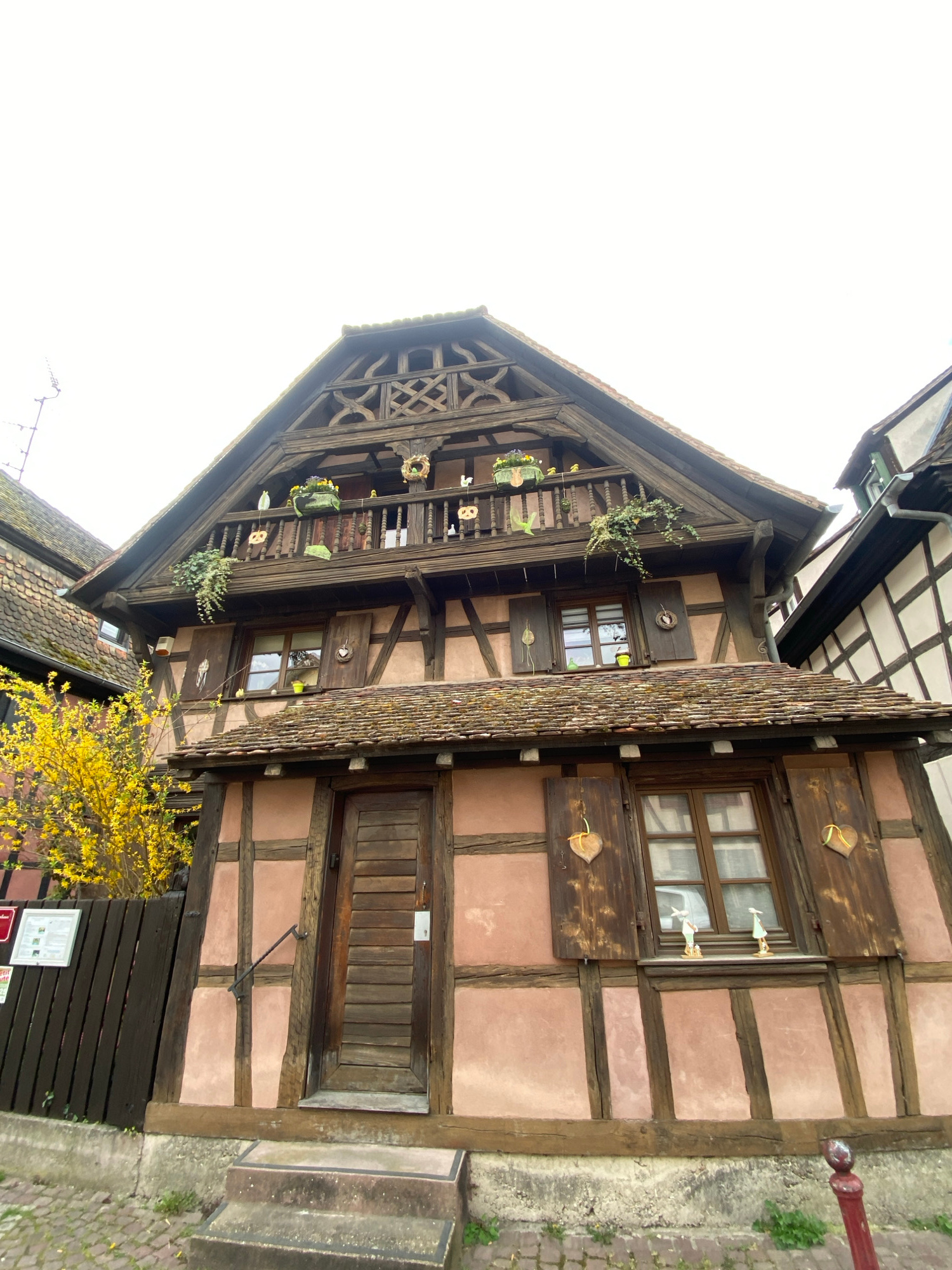 The image shows a vertical view of a traditional half-timbered house in Schiltigheim, France. The building features a steeply pitched roof and exposed wooden beams filled with pinkish-tan stucco. The…read more