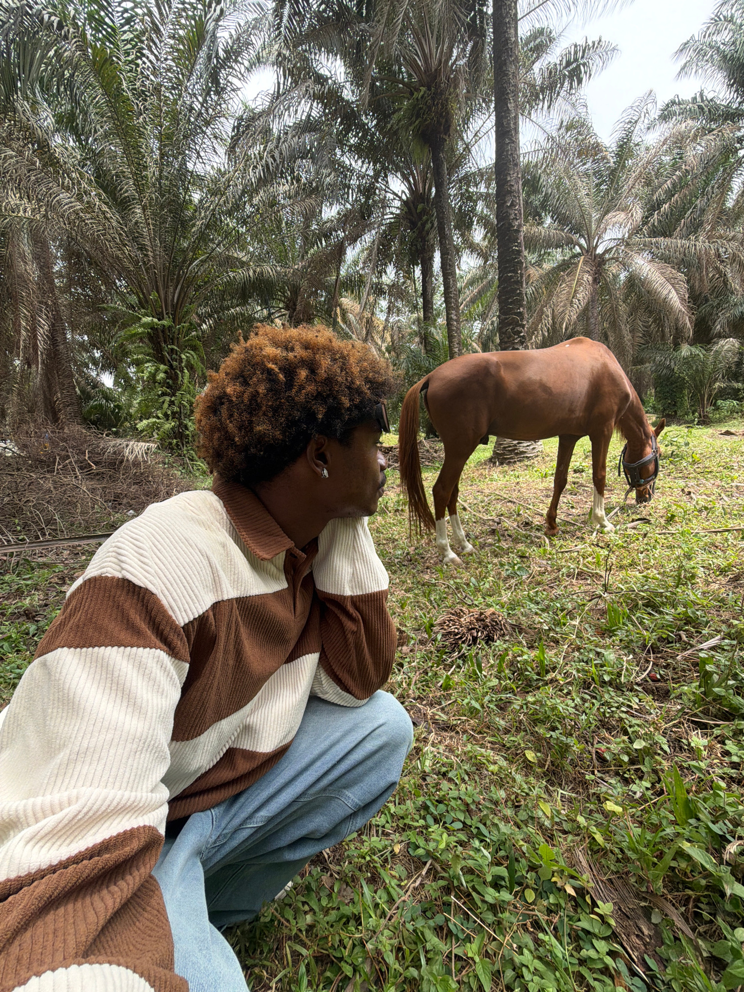 The image displays an outdoor scene in Lekki, Nigeria, characterized by dense vegetation. In the foreground, a dark-skinned individual with curly brown hair, wearing a horizontally striped brown and o…read more