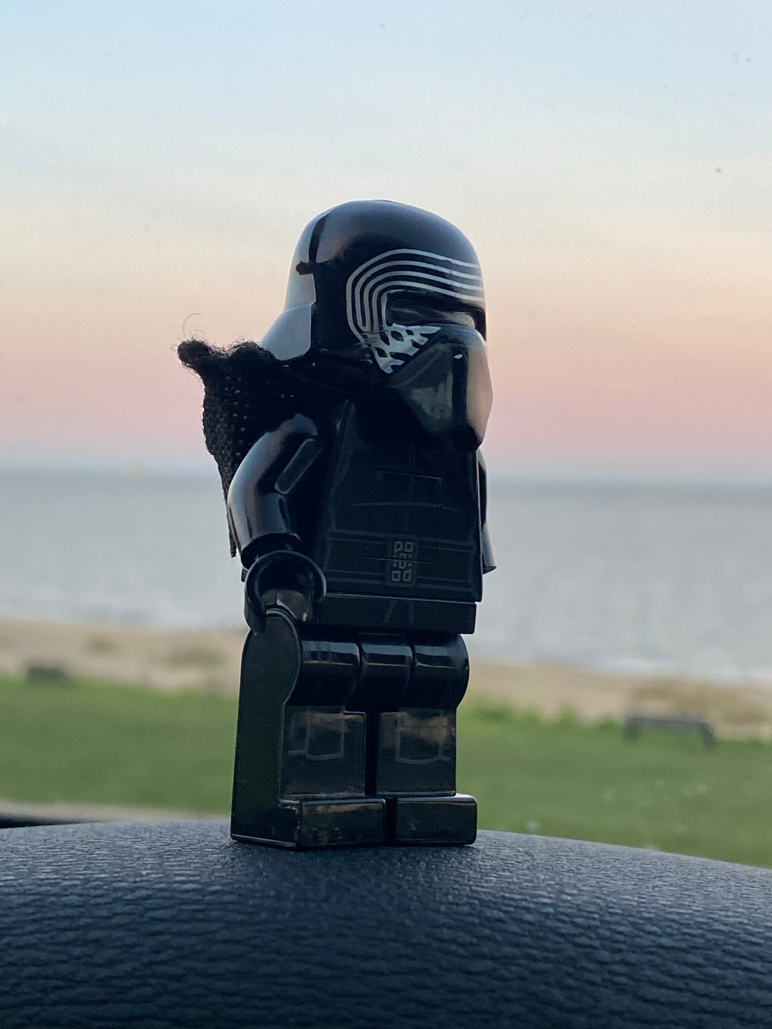 A close-up, eye-level, vertical shot depicts a black Lego Kylo Ren figure resting on a dark, textured surface, likely a car dashboard, with a blurred background showing a horizon of water and green la…read more