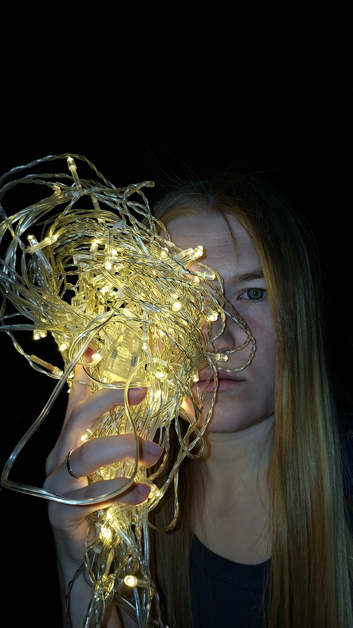 A woman with long, light-brown hair is lying down against a dark background. She is holding a tangle of string lights close to her face. Her eyes are visible above the lights. She is wearing a dark sh…read more
