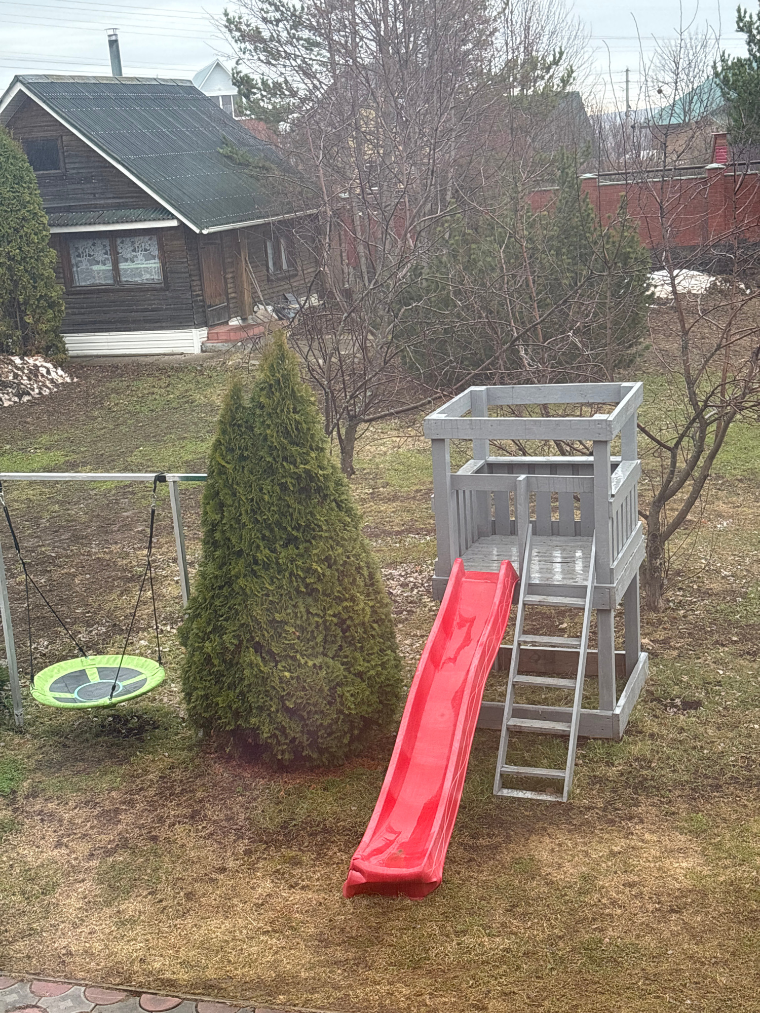 The image depicts a backyard scene in Ферма, Russia. A wooden play structure, painted gray, dominates the scene. The structure includes a ladder, a platform, and a red plastic slide. Near the slide is…read more