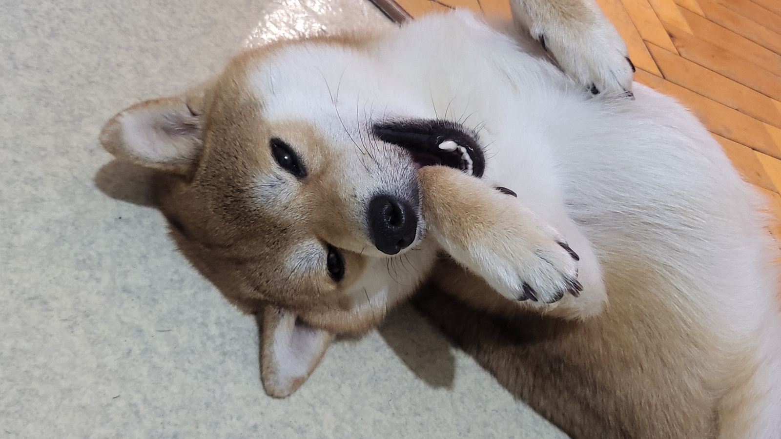 An overhead shot captures a tan and white dog, resembling a Shiba Inu, lying playfully on its back indoors in Markovskii, Russia. The dog's light-colored belly and chest are exposed, indicating a stat…read more