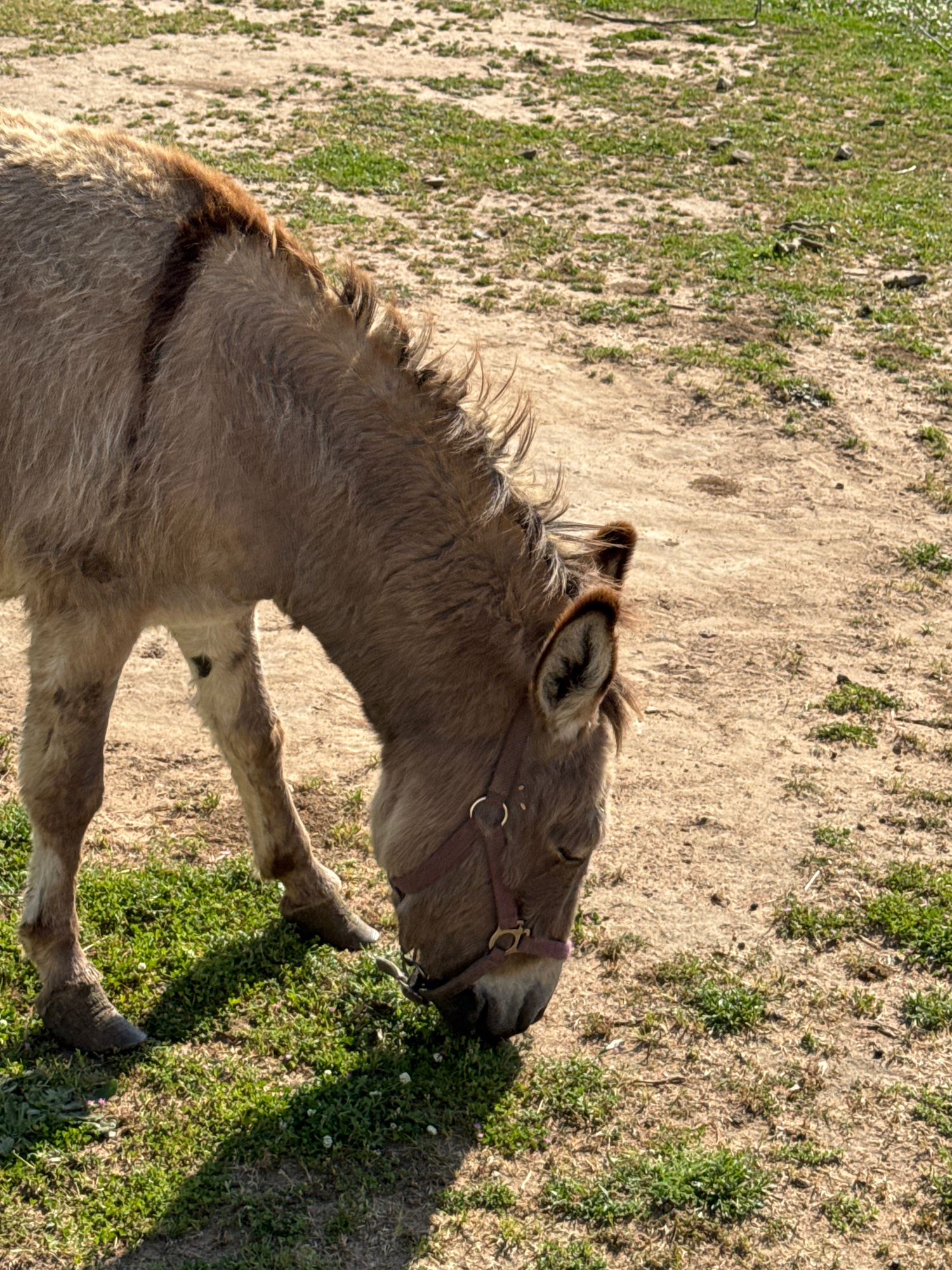 A light brown donkey with a red halter is grazing on a patch of green grass. The donkey's head is down, and its front legs are on the grass while its back legs are partially visible. The background is…read more