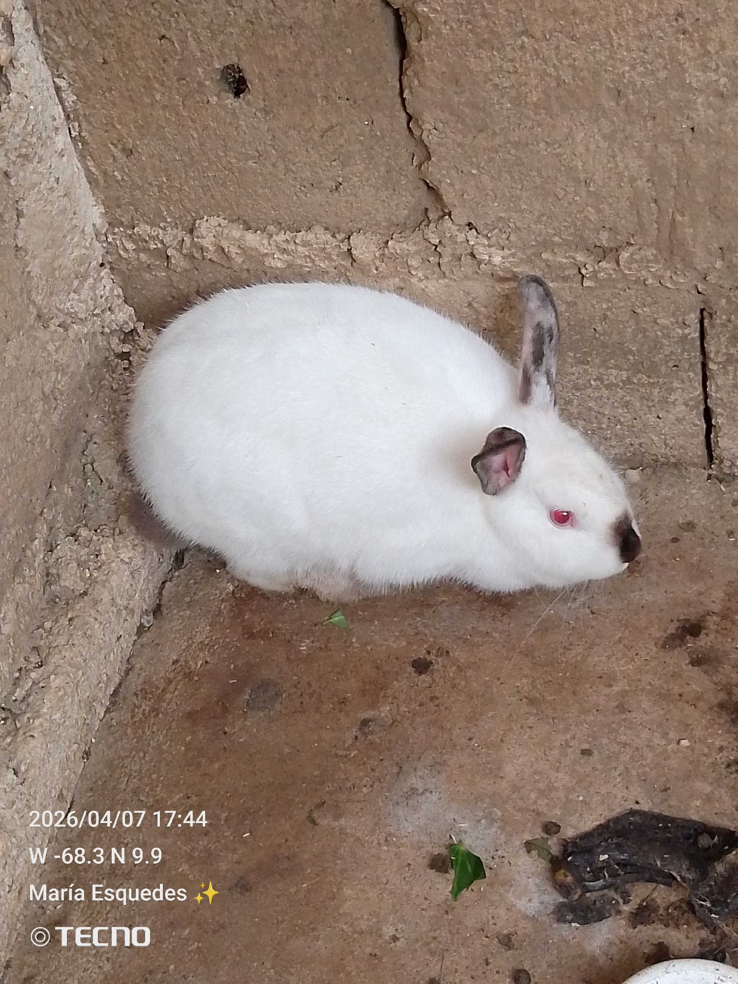 The image depicts a white rabbit with red eyes, black nose and ears, sitting on a rough, uneven surface. The rabbit is positioned in the corner of an enclosure made of concrete blocks. There is some d…read more